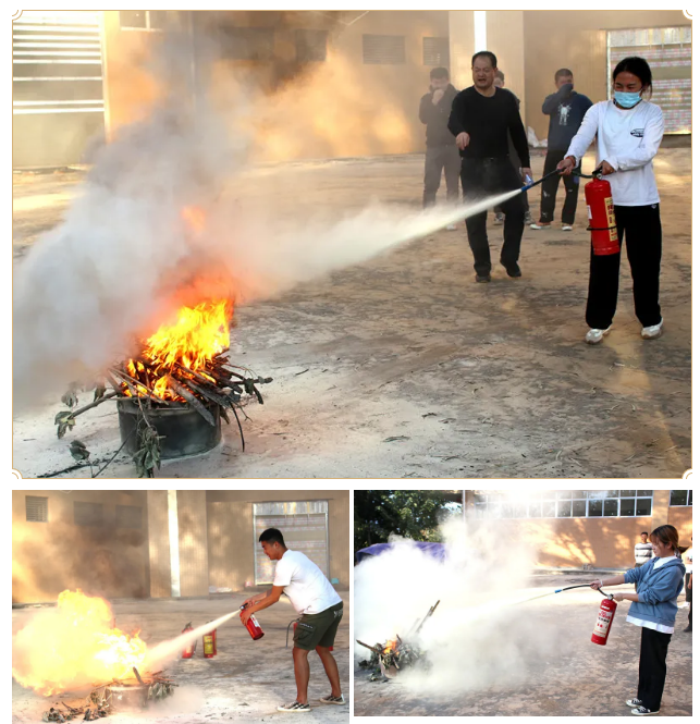 灭火演练开始,保卫处张云友引燃两个柴堆,熊熊大火迅速燃烧起来,倪副处长再次按照灭火流程进行灭火示范。教师和学生代表严格按照灭火流程,有序使用灭火器现场进行灭火实际操作,两个柴堆反复被浇上汽油并引燃,又反复被师生们用干粉灭火器扑灭,大家在反复实践中掌握灭火器的使用方法及灭火技巧。