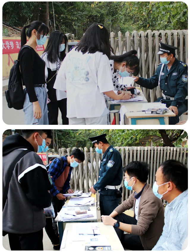 从早上7:30分开始,考生陆续来到攀西职院,在学院大门口对考生进行身份核实、扫健康码和场所码、体温检测、详细登记相关信息后进入校园,并在考场外等候入场。来自米易县攀莲镇派出所的公安干警在考场四周巡视,为本次考试作好安全保障工作。8:20分,在工作人员的引导下,考生按规定放置好随身物品,核验准考证、身份证,并接受安全检查,按考场工作人员要求,进入相应考室参加考试。
