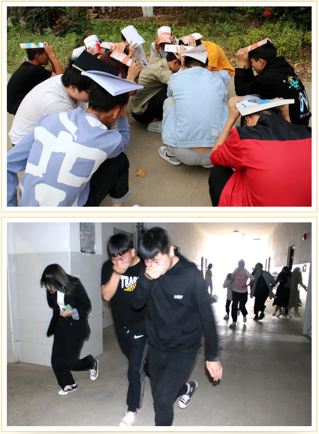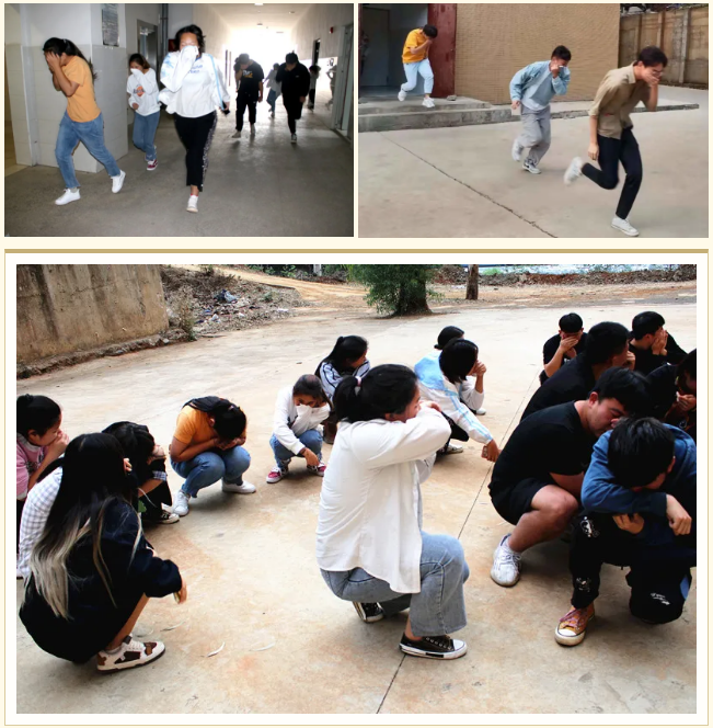 17:30分,消防、防震演练正式开始。当火灾警报声响起时,学生们在上课老师的组织下,用衣服、毛巾等捂住口鼻,弯腰、弓背,沿预定消防路线迅速、有序撤离教室,到达教学楼前的空地集合并清点人数。在地震演练中,当听到地震警报声,同学们迅速躲在课桌下,随后在任课教师的指挥下,用书包、书等遮挡住头部,沿预定撤离路线快速撤离到教学楼前的空地集合并清点人员,完成防震演练。