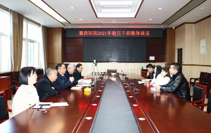 2021年12月29日上午,攀西职院在二实训楼会议室召开新任干部集体谈话会,学院党支部书记、省教育督导专员万辉君教授,执行院长赵海林,副院长李玉德,组织人事处处长曾祥明、副处长马小林及新任干部参加会议,赵海林主持会议。