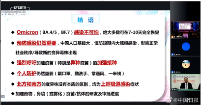 钟南山院士总结了两年多来抗疫取得的成就,系统地分析了全国范围和第二波奥密克戎疫情的特点,介绍奥密克戎的生物学特征、致病性以及如何科学地防范病毒。同时对于加强个人防护提出了8条建议:即加强防护(戴口罩、保持距离、减少公众聚集等);不应为感染而害怕;大多数感染者不需要去医院;居家注意常做抗原检测;若持续发热一定要去医院;患一般慢性病的老年人也要打疫苗;囤药没有太大必要;“老药新用”要经严格实验。