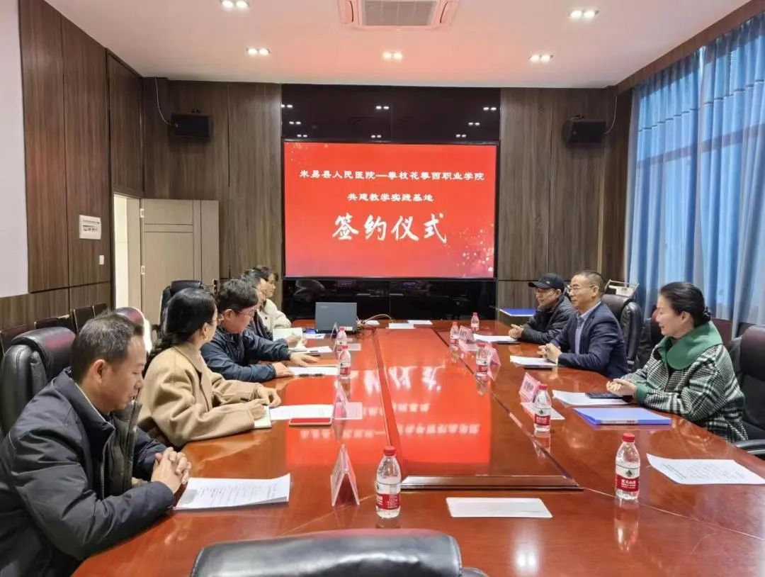 1月8日,我校与米易县人民医院共建教学实践基地洽谈会暨签约授牌仪式在米易县人民医院五楼会议室举行。我校执行院长赵海林、现代农业系主任曾成华、中医养生保健专业负责人姜雅晴,米易县人民医院党委副书记、副院长朱永高,副院长兰宏政、医务科科长朱君、科教科副科长张莉萍、康复医学科主任丁勇等出席了此次活动。本次签约仪式的成功举行,开启了双方深度合作、共同发展的新篇章。