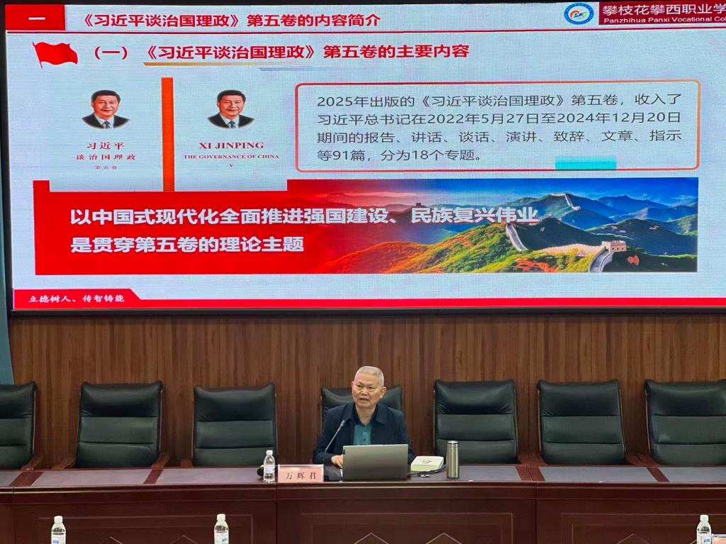 党委书记、省督导专员万辉君以《学好用好<习近平谈治国理政>第五卷》为题,从“《习近平谈治国理政》第五卷的内容简介”“《习近平谈治国理政》第五卷的核心要义”“《习近平谈治国理政》第一至五卷内在联系”“学好用好《习近平谈治国理政》第五卷”等四个方面作专题辅导报告。万辉君指出,《习近平谈治国理政》第五卷生动记录了习近平总书记带领党和人民继续进行伟大斗争、建设伟大工程、推进伟大事业、实现伟大梦想的历史进程,集中展现了我们党坚持“两个结合”、推进马克思主义中国化时代化的最新成果,充分反映了我们党为推动构建人类命运共同体贡献的智慧担当,深刻回答了中国之问、世界之问、人民之问、时代之问,是进一步学习贯彻习近平新时代中国特色社会主义思想的权威教材。他强调,要深刻把握《习近平谈治国理政》第五卷的理论逻辑、历史逻辑、实践逻辑,要原原本本学、融会贯通学、联系实际学,切实把学习成果转化为推动学校高质量发展的强大动力。