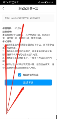 ⑦阅读答题时长、题量说明、考试说明并勾选【我已阅读并同意】按钮---点击【继续考试】---点击【进入考试】;