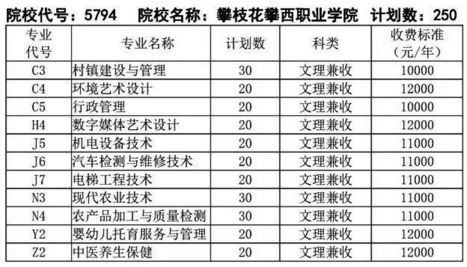 学院紧紧围绕区域经济社会发展需求和战略性新兴产业,立足攀西地区战略资源创新开发,致力于为钒钛材料应用、现代农业和阳光康养等产业的发展培养高素质技术技能人才,现开设现代农业技术、农产品加工与质量检测、村镇建设与管理、环境艺术设计、中医养生保健、汽车检测与维修技术、空中乘务、数字媒体艺术设计、机电设备技术、行政管理、婴幼儿托育服务与管理、电梯工程技术等12个专业。