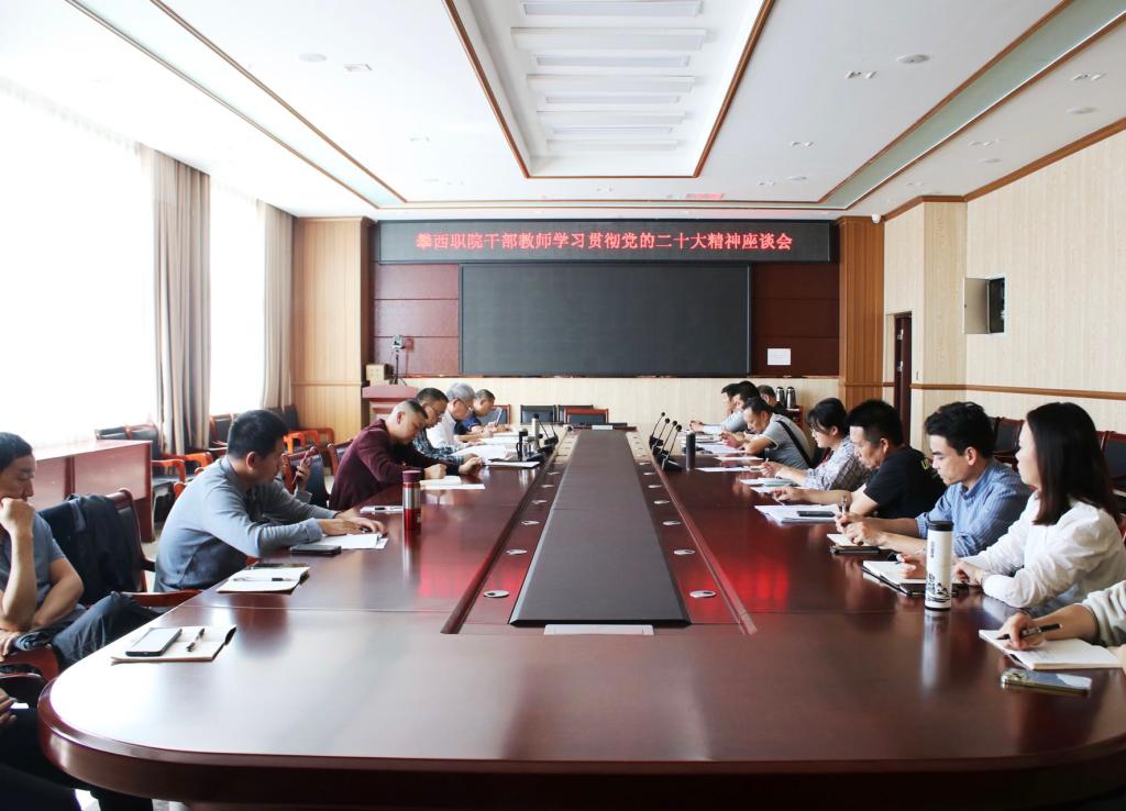 10月28日,球探体育平台中国登陆入口在二实训楼4楼会议室召开干部教师学习贯彻党的二十大精神座谈会,学习党的二十大精神和省、市、县委常委会(扩大)会议精神,畅谈学习体会,研究部署贯彻落实措施。学校党支部书记、省督导专员万辉君,党支部副书记、执行院长赵海林出席座谈会并讲话。学校各处室、系部负责人和教师代表参加座谈会。赵海林主持学习座谈会并原文领学了党的二十大报告,就报告中的重要思想、重要观点、重大论断、重大部署等进行了讲解。
