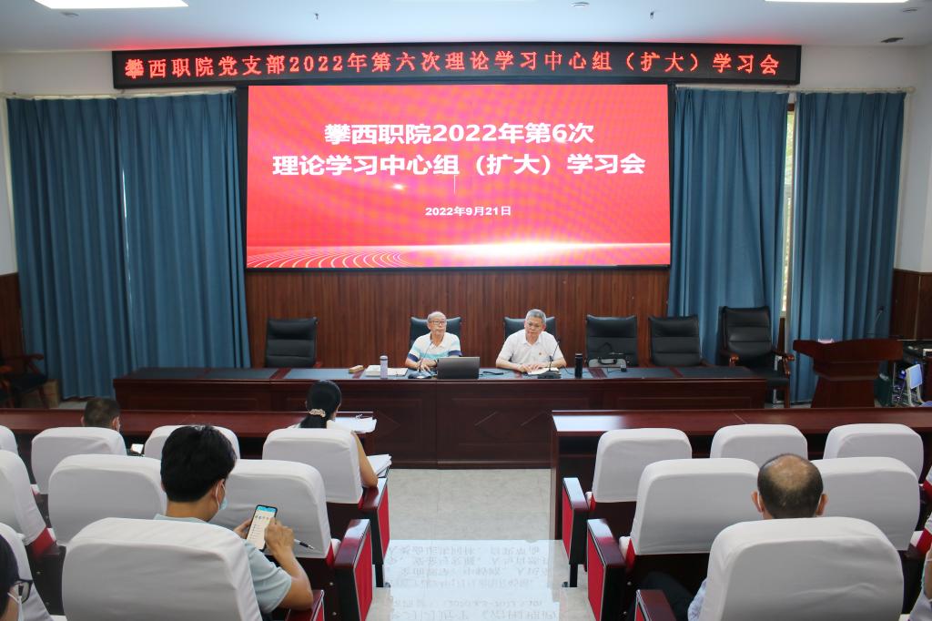 9月21日下午,学校党支部在二实训楼阶梯教室召开2022年第6次理论学习中心组(扩大)学习会,专题学习《习近平谈治国理政》第四卷、习近平在省部级主要领导干部“学习习近平总书记重要讲话精神,迎接党的二十大”专题研讨班上发表的重要讲话精神以及9月9日中央政治局会议和四川省委工作会议精神等。学校全体教职工以及华森公司领导、各党支部书记、公司各单位负责人参加学习会。学校宣传统战处处长周荣辉教授主持学习会。
