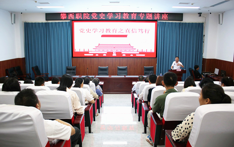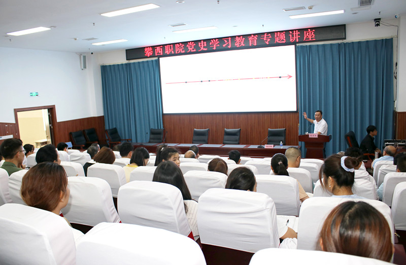 为庆祝中国共产党成立100周年,扎实开展党史学习教育,2021年6月4日下午3点,攀西职院基础教学与公共管理系主任、攀枝花市米易县党史学习教育宣讲团成员伍亚林在二实训楼阶梯教室作“党史学习教育之真信笃行”专题讲座。学院全体党员、中层以上干部、全体教职员工参加讲座。党史学习教育办公室主任周荣辉主持讲座。