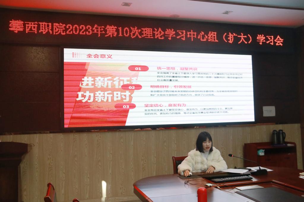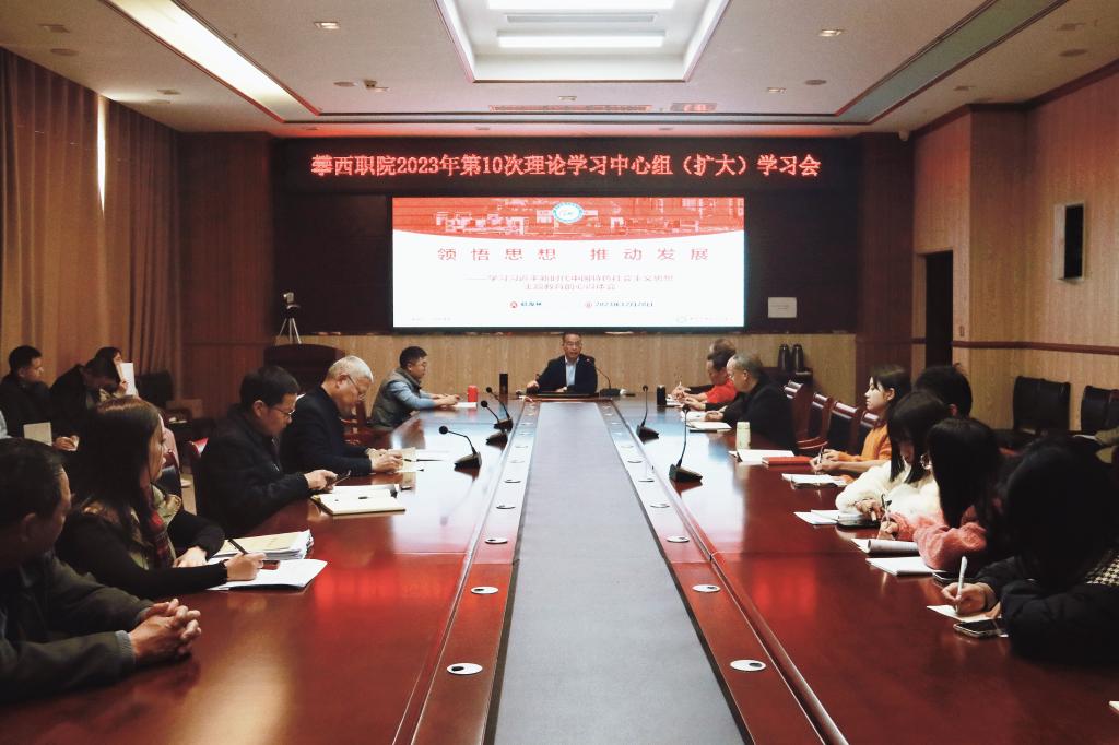 12月28日下午,球探体育平台中国登陆入口在二实训楼四楼会议室召开2023年第10次理论学习中心组(扩大)学习会。学校书记、省督导专员万辉君主持会议,副书记兼执行院长赵海林、副院长李玉德以及学校全体教职工参加学习会。