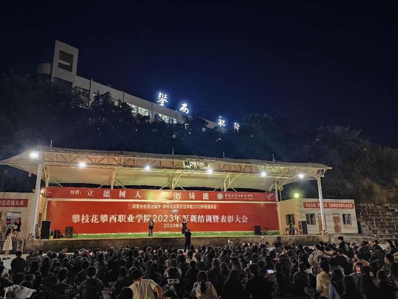 全体师生秩序井然地在指定位置就坐。活动开始,主持人介绍了到场校领导和嘉宾,并宣布晚会开始。