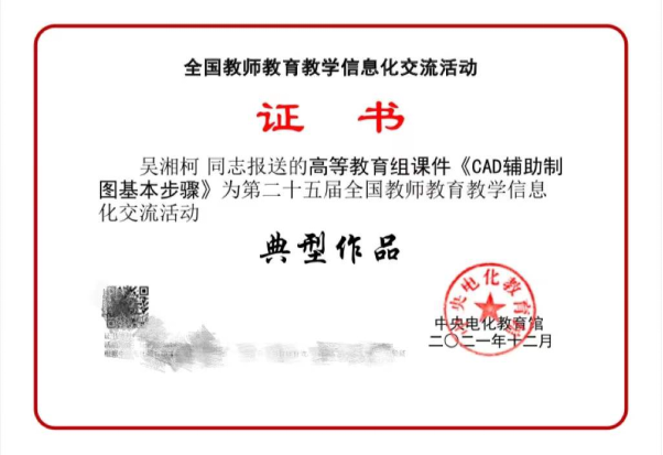 2021年12月31日,由教育部指导、中央电化教育馆主办的“第二十五届全国教师教育教学信息化交流活动”(原全国多媒体教育软件大奖赛)落下帷幕,艺术设计系教师吴湘柯制作的《CAD辅助制图基本步骤》多媒体课件荣获高等教育组课件全国典型作品,这是我校教师首次入围该项比赛并获奖。
