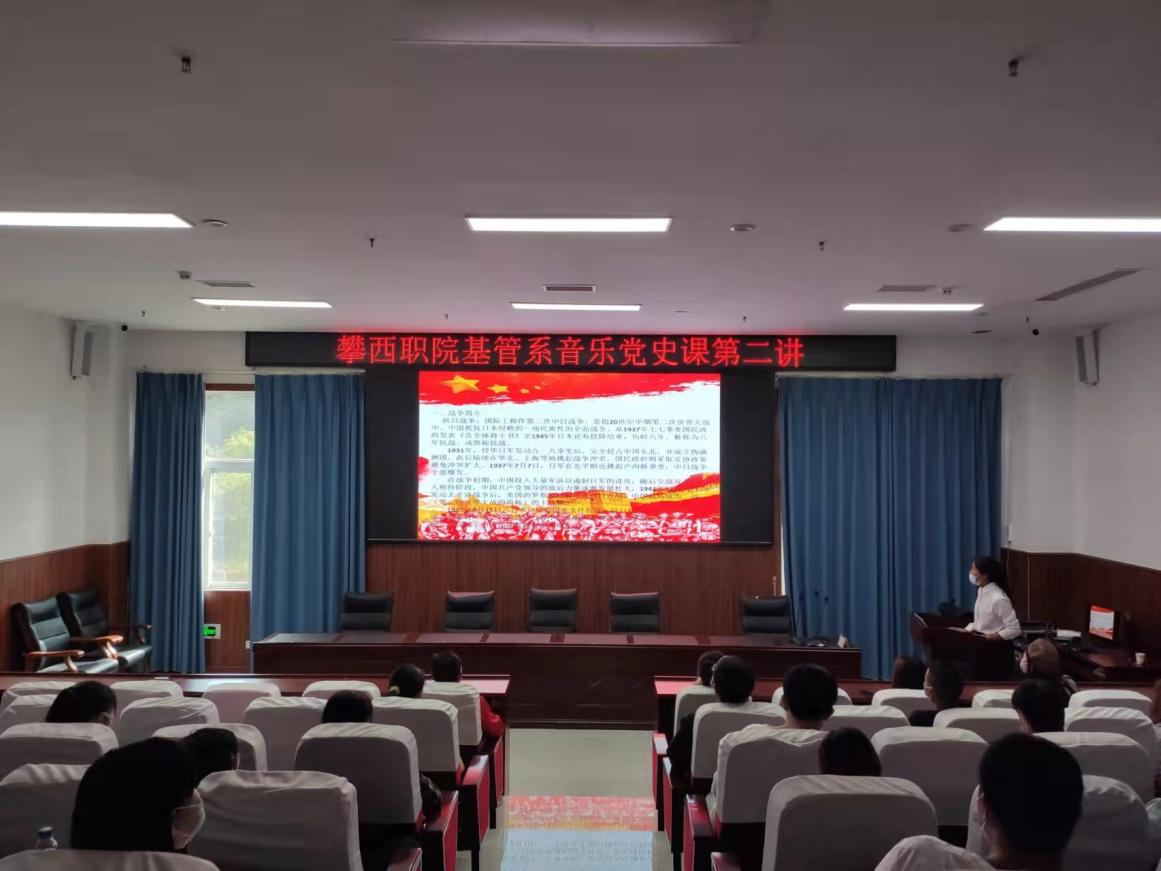 球探体育平台中国登陆入口基础教学与公共管理系于2021年11月11日在二实训楼阶梯教室举行了音乐党史课第二讲,全系师生参加。此次活动由我系大二学生雪梅主持,她从历史背景、历史人物、战争爆发的原因、歌曲内容、作曲作者及曲风五个方面声情并茂的为我们讲解了抗战时期的种种英雄事迹。
