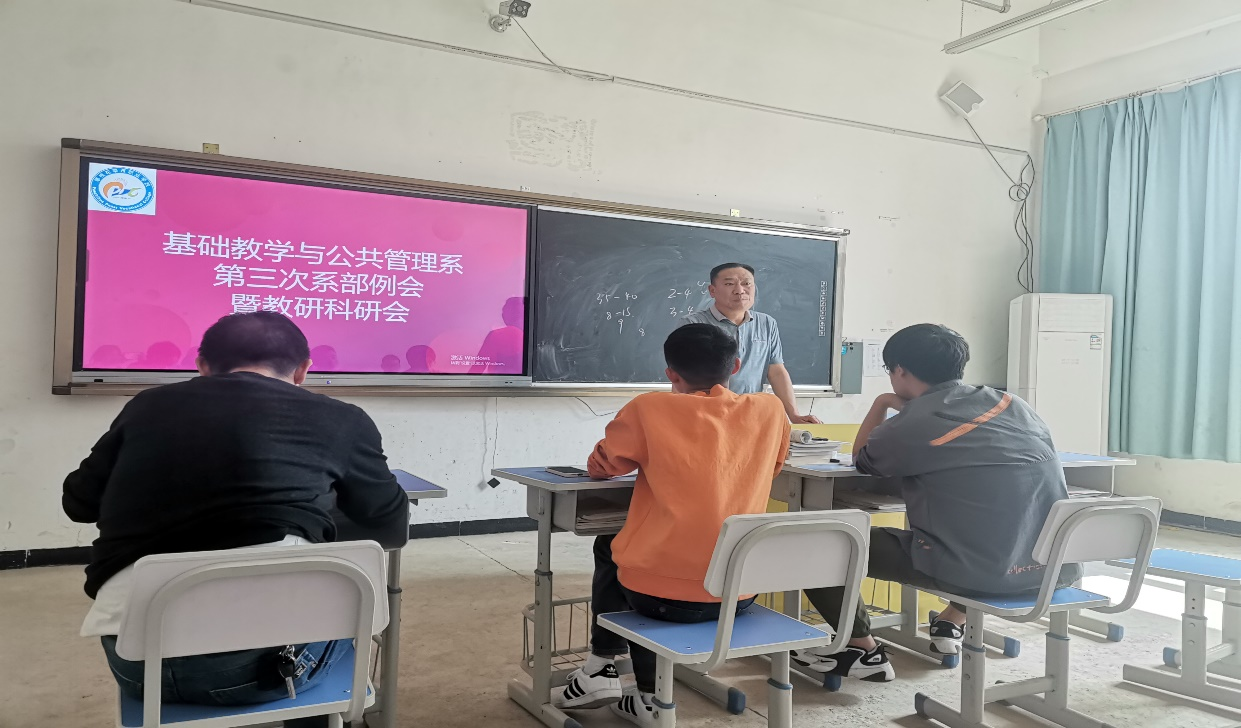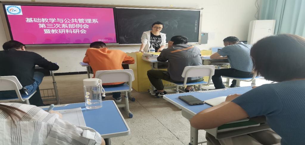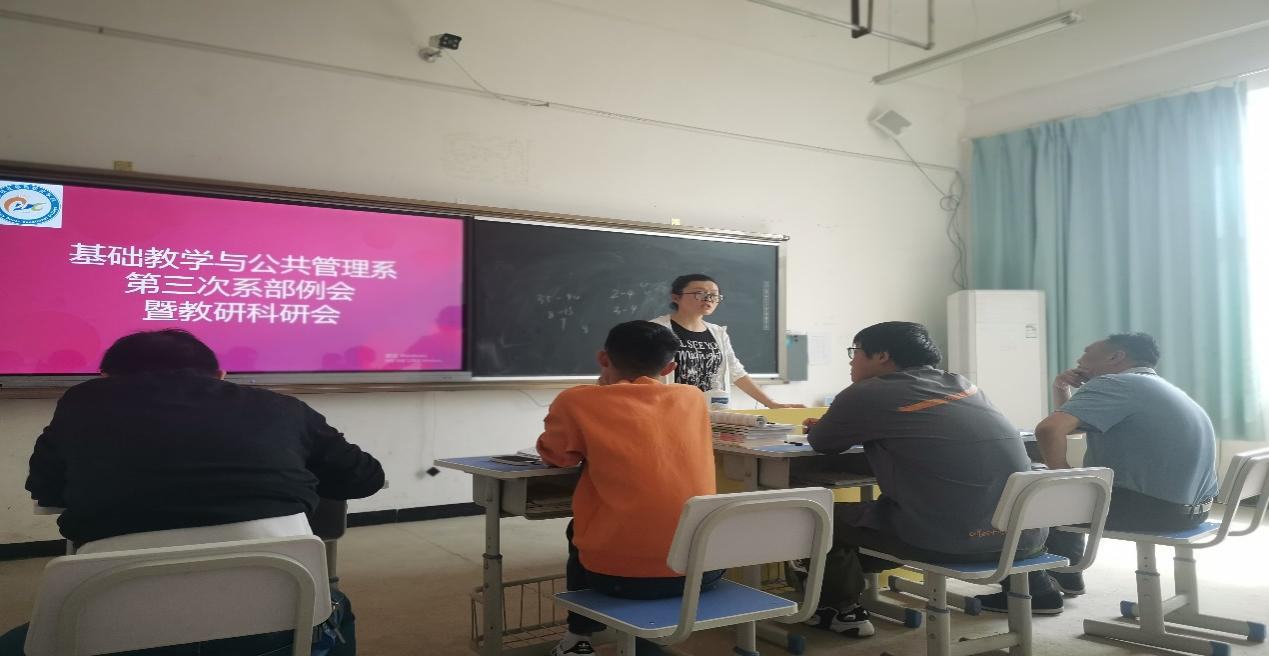 球探体育平台中国登陆入口基础教学与公共管理系于2022年4月15日在二实训楼3-1教室举行第三次例会暨教研科研会。本次会议由付君副主任主持,我系全体教师参加。