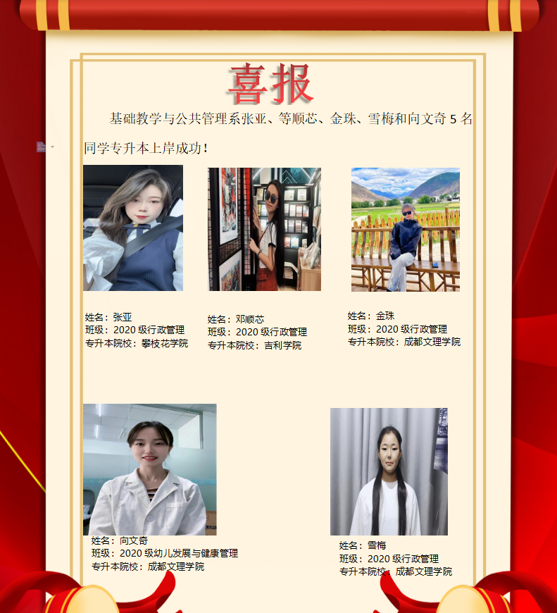 奋斗改变终点,梦想成就未来。近日,基础教学与公共管理系5名专升本毕业生陆续向母校发回喜讯,她们在2023年专升本招生考试中取得优异成绩,分别升本到攀枝花学院、成都文理学院、吉利学院。