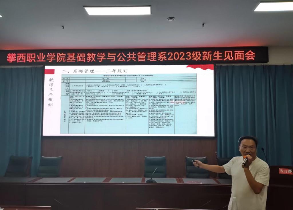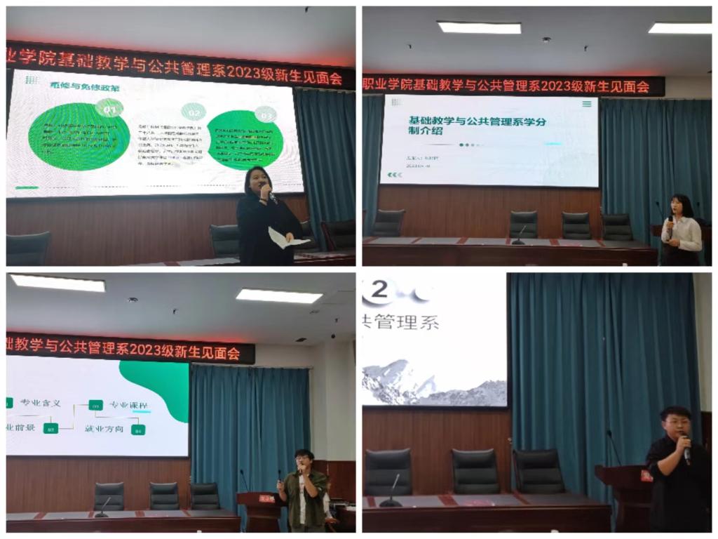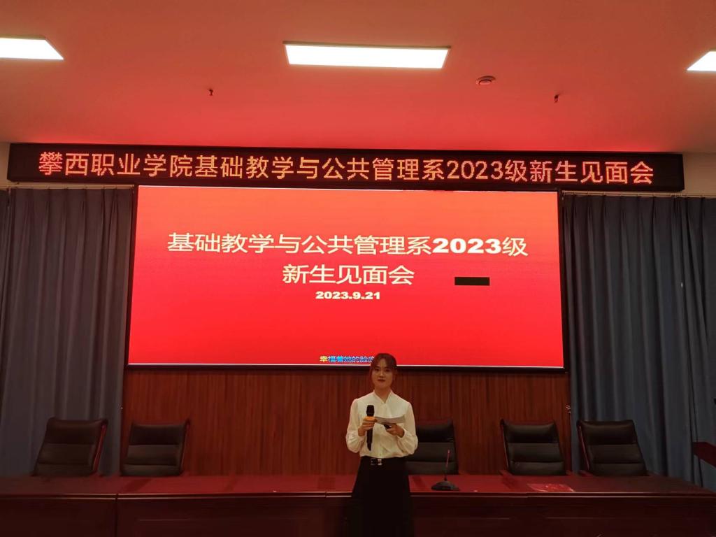 为了增进2023级新生与老师的交流与沟通,为了增加老师对学生的了解,同时也为了新生对本专业以及今后的大学生活有初步认识。基础教学与公共管理系于2023年9月21日,在二楼阶梯教室举行2023级新生见面会。此次见面会基础教学与公共管理系全体师生参加,左开媛老师主持。