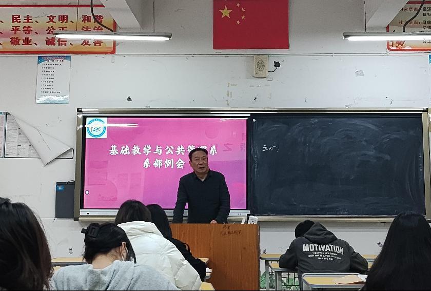 为了加强教师对各专业人才培养理念深度认识,引领教学提质,基础教学与公共管理系于12月7日,在教学楼212召开教学例会。会议由系主任伍亚林主持,基础教学与公共管理系全体教师参加。
