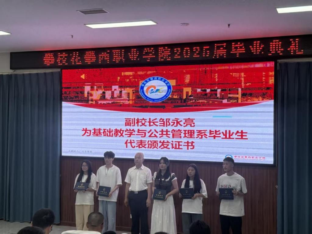 毕业典礼现场,副校长邹永亮为基础教学与公共管理系毕业生代表颁发证书,这一庄重时刻,是学校对学子学业成果的肯定,更是期许他们以所学奔赴广阔未来。