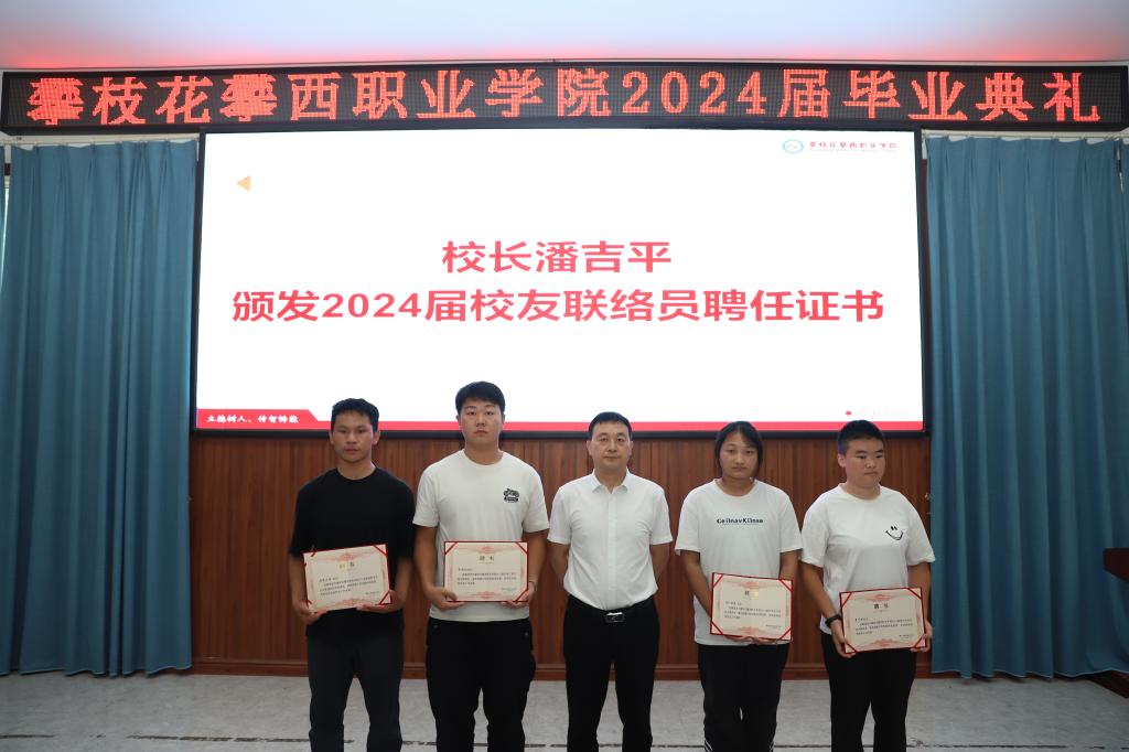 副校长邹永亮宣读《球探体育平台中国登陆入口关于聘任2024届毕业生校友会联络员的通知》。校长潘吉平为校友联络员颁发聘书。