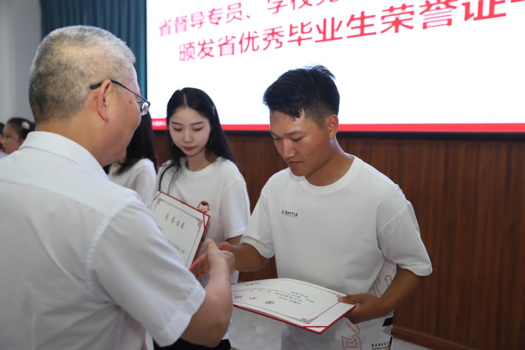 学校党支部副书记、执行校长赵海林宣读《四川省教育厅关于公布2024届四川省优秀大学毕业生认定结果的通知》并宣读我校优秀毕业生,省督导专员、学校党支部书记万辉君教授为省优秀毕业生颁奖。