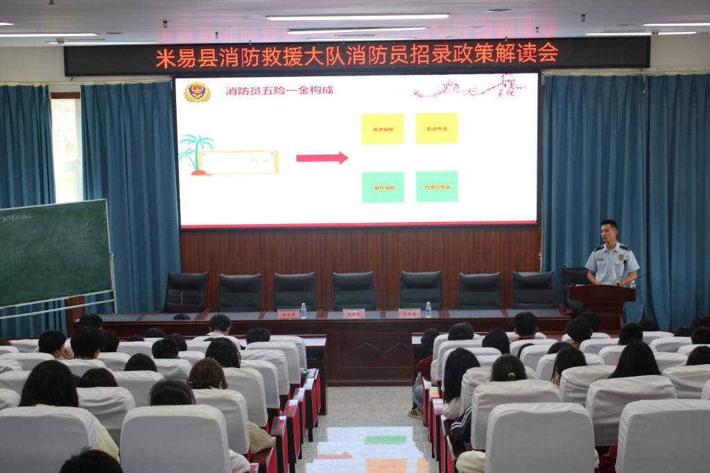 随后,商晓客副站长用一帧帧图片带大家领略消防员们的日常工作。消防救援队伍作为离老百姓最近、联系最紧密的队伍,他们用自己过硬的本领和精湛的技能来守卫城市万家灯火。接着,他从如何才能当上一名光荣的消防员、消防员需要具备的个人素质等方面开启消防员征招政策宣讲。对消防员招录条件及范围、招录程序、编制及退出的安置政策、工资待遇及休假政策、职业发展空间等五个方面解读消防员征招录用的政策条件。同时还介绍了消防员的招录需要通过报名、资格审查、体检、政审、体测、心理测试等9个程序。他表示,时代呼唤英雄,百姓盼望平安,正气需要弘扬。希望同学们积极加入消防救援队伍这个大家庭。