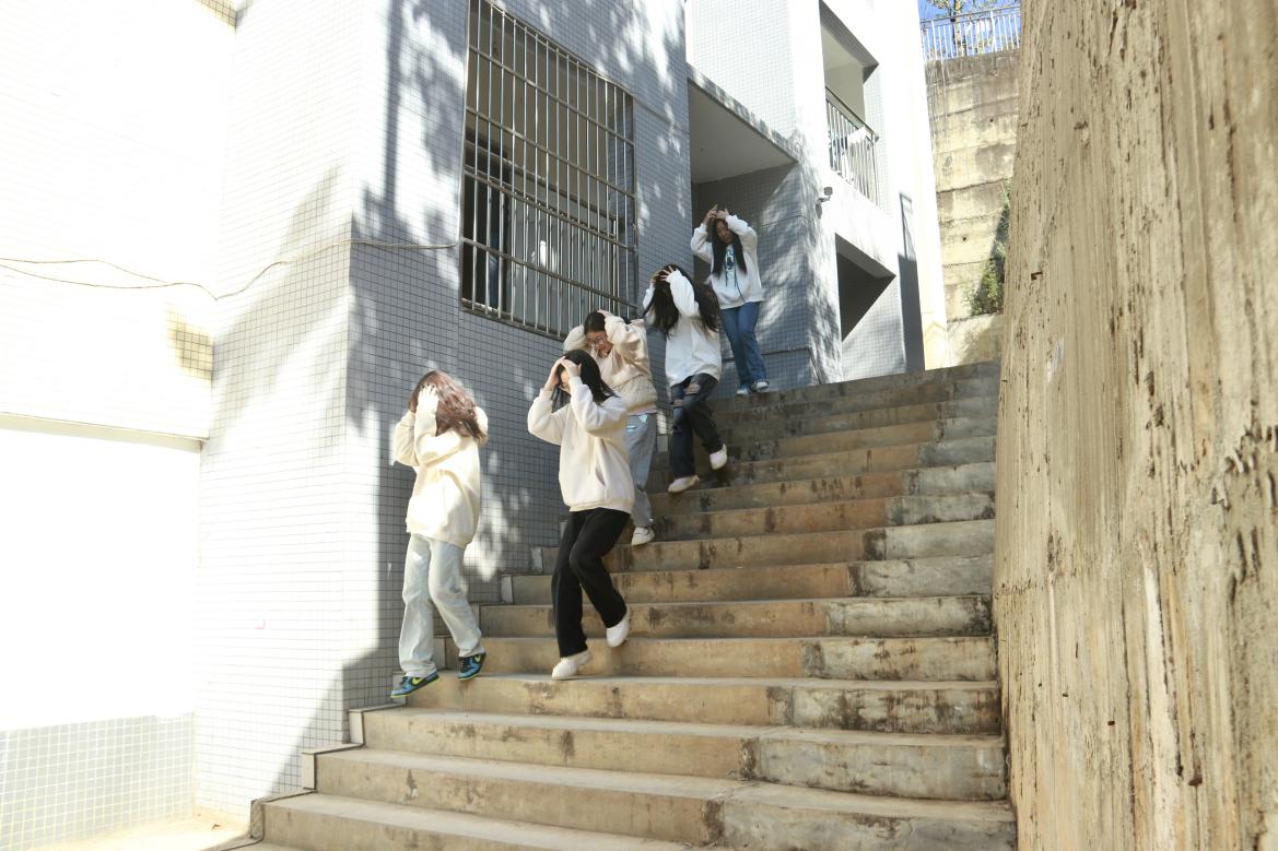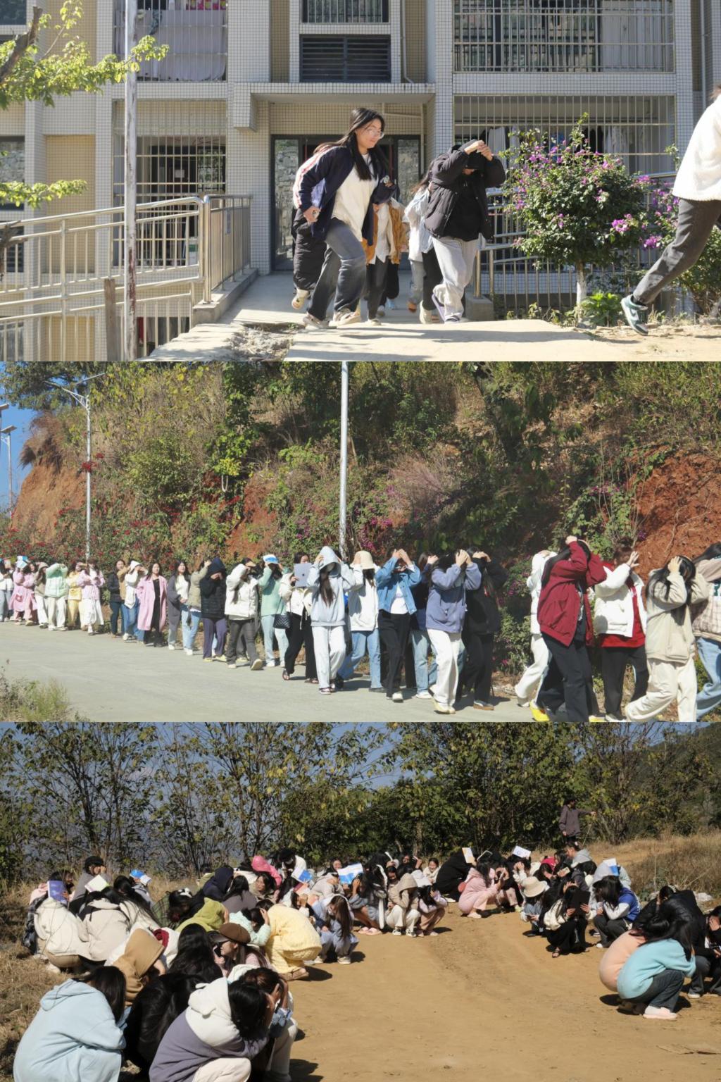 当第一次警报响起,在宿舍的同学迅速双手抱头,蹲在桌子旁、角落等三角地带。当第二次警报声响起宿舍楼内学生立即双手抱头、弯腰低身、沿着预定路线,快速有序地撤离,耗时仅70秒,所有学生被疏散到指定位置。