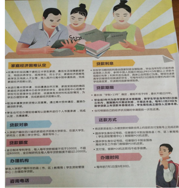 为了“不让一个学生因家庭经济困难而失学”近日,县教育局下发了四川省国家开发银行生源地信用助学贷款宣传单,我校立刻对参加2020年升学考试的所有学生进行大学生生源地信用助学贷款优惠政策宣传。并下发助学贷款申请指南等形式,指导学生做好资格认定工作。通过介绍生源地助学贷款政策、还款流程、学制及账户变更等相关要求,提高助学贷款工作的准确性和办理效率,避免学生及家长多次往返奔波