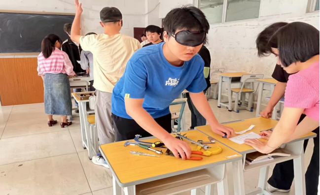 学生正在参加蒙眼识工具赛项的比赛