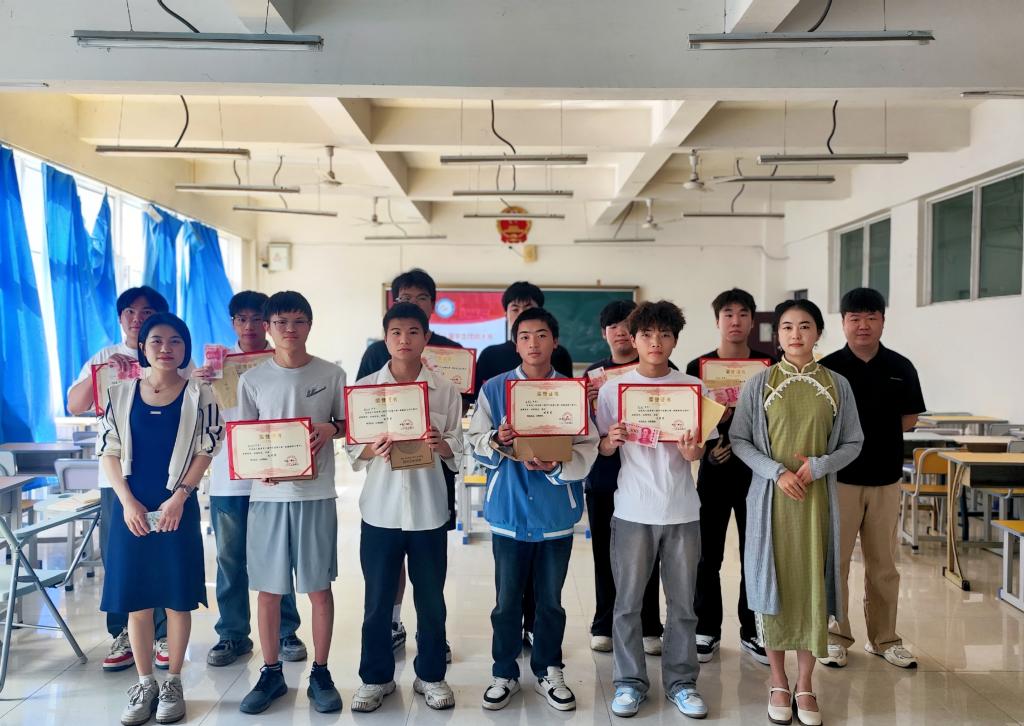 系部领导和教师(前排左一系副主任程茜、前排右一系主任助理谢韦苇、后排右一教师邓潮林)为获奖同学颁奖并合影留念。