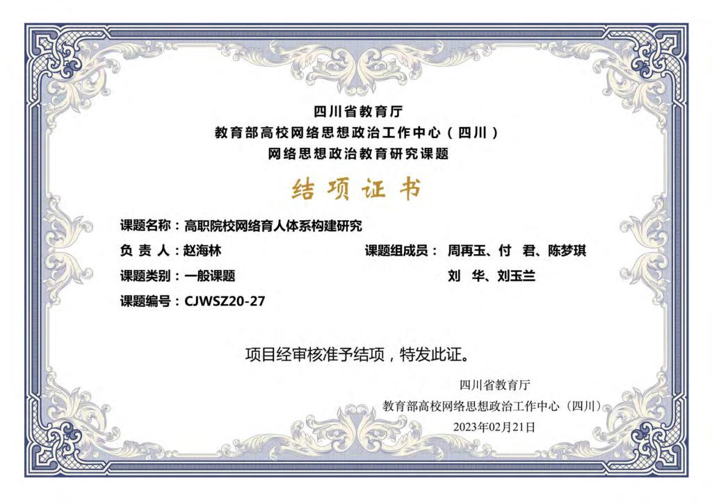 近日,四川省教育厅 教育部高校网络思想政治工作中心(四川)公布“2020年网络思想政治教育研究课题结题项目评审结果”,其中,由我校赵海林主持,周再玉、付君、陈梦琪、刘华、刘玉兰等5位老师参与的省级课题《高职院校网络育人体系构建研究》顺利结题。