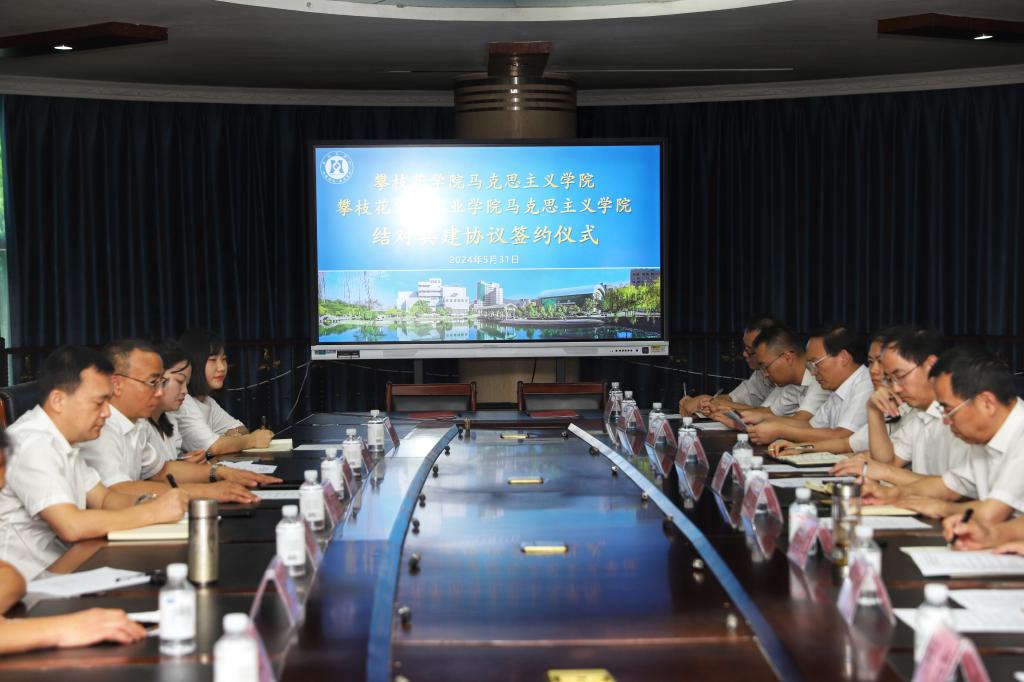 为深入学习贯彻习近平新时代中国特色社会主义思想和党的二十大精神,认真学习贯彻习近平总书记对学校思政课建设的重要指示精神,全面贯彻党的教育方针,落实中共四川省教育工委、四川省教育厅《关于开展四川省高校马克思主义学院结对共建行动的通知》的要求,5月31日,我校马克思主义学院与攀枝花学院马克思主义学院在攀枝花学院举行了结对共建协议签约仪式。攀枝花学院党委常委、副校长张旭辉,球探体育平台中国登陆入口院长潘吉平、党支部副书记赵海林等出席,双方有关部门领导及教师共同参加,见证签约仪式。