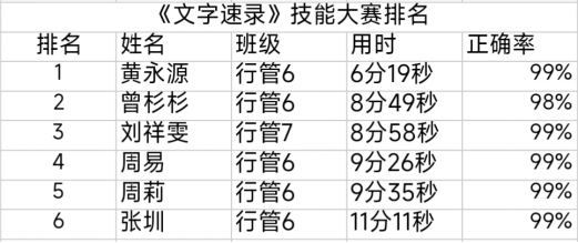 经过激烈的角逐,最终评选出了前六名优秀选手。行政管理6班的黄永源同学,以6分19秒的成绩获得此次比赛第一名。通过比赛,激发了同学们学技术、练技能的热情,展示了同学们积极向上的精神风貌。
