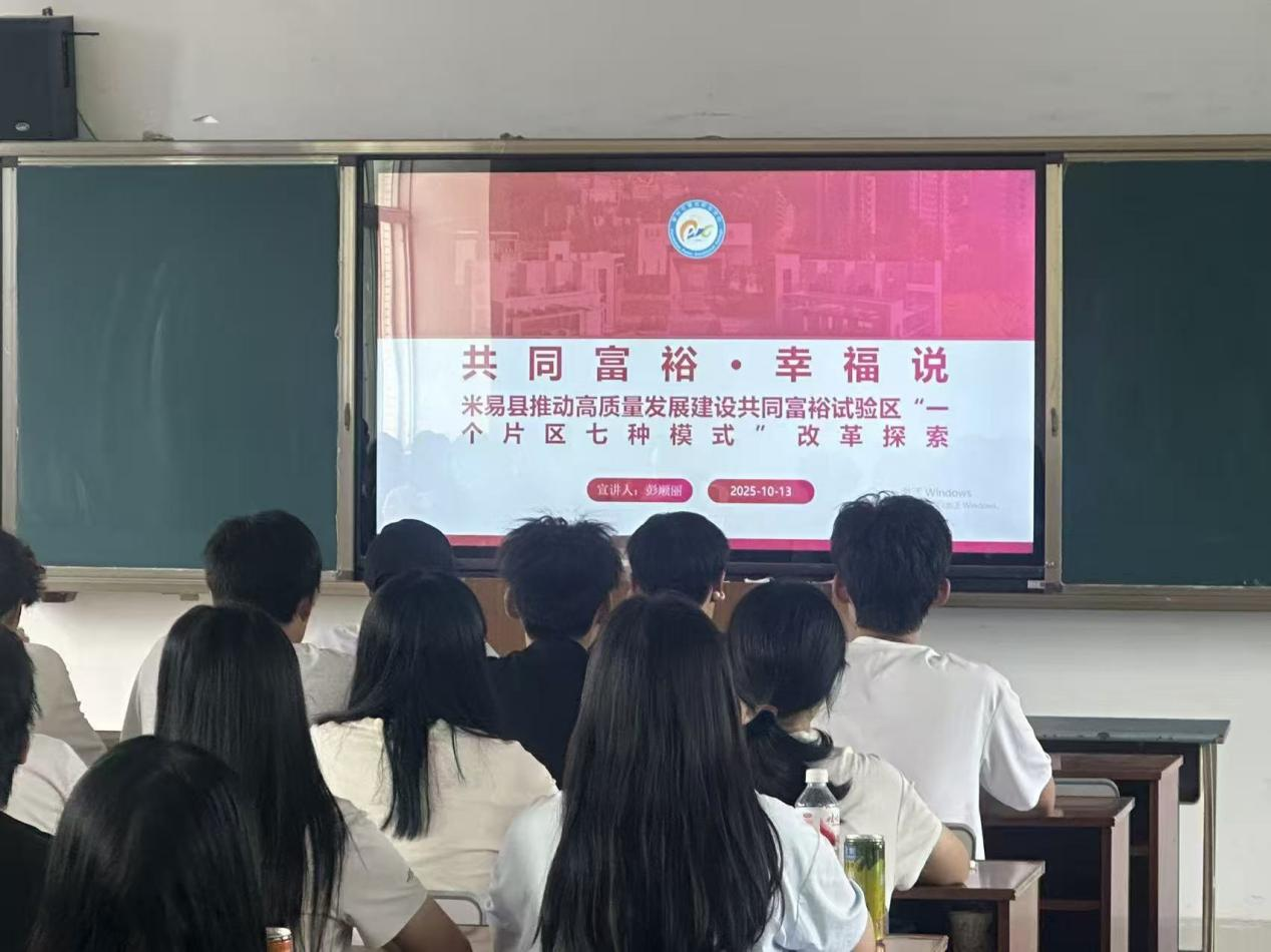 2025年10月14日,球探体育平台中国登陆入口马克思主义学院院长助理彭顺丽老师,在学院324教室开展“共同富裕・幸福说”专题宣讲,为师生深入解读米易县在共同富裕道路上的创新实践与显著成效。