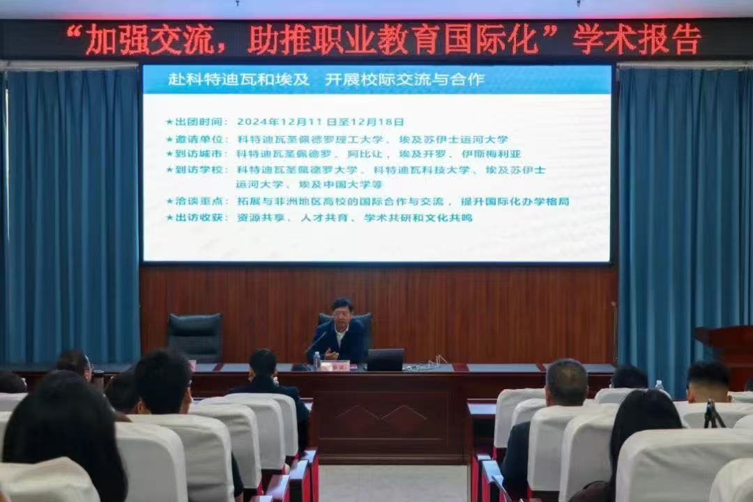 报告会上,石维富以赴非洲科特迪瓦和埃及为例,从非洲部分高等学校情况、中非国际教育交流情况、中非交流意愿等方面进行讲解;阐述了可以从优势学科深入合作、实施学位互认合作、申请“一带一路” 项目科研合作,广泛开展的文化交流等推进职业教育国际化。为我校在落实全国全省教育大会精神,探索开展国际化办学方面提供了指引和优秀经验。