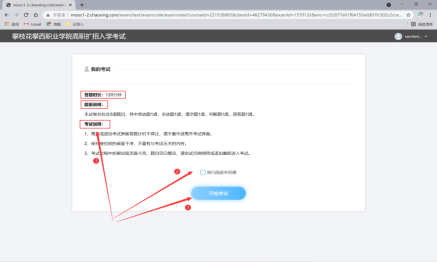 ⑤阅读答题时长、题量说明、考试说明等考试信息,勾选【我已阅读并同意】按钮,点击【开始考试】;