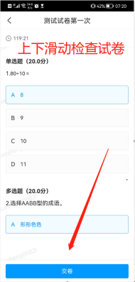 ⑨答题结束可以上下滑动,检查整个试卷的答题情况,检查结束点击【交卷】。