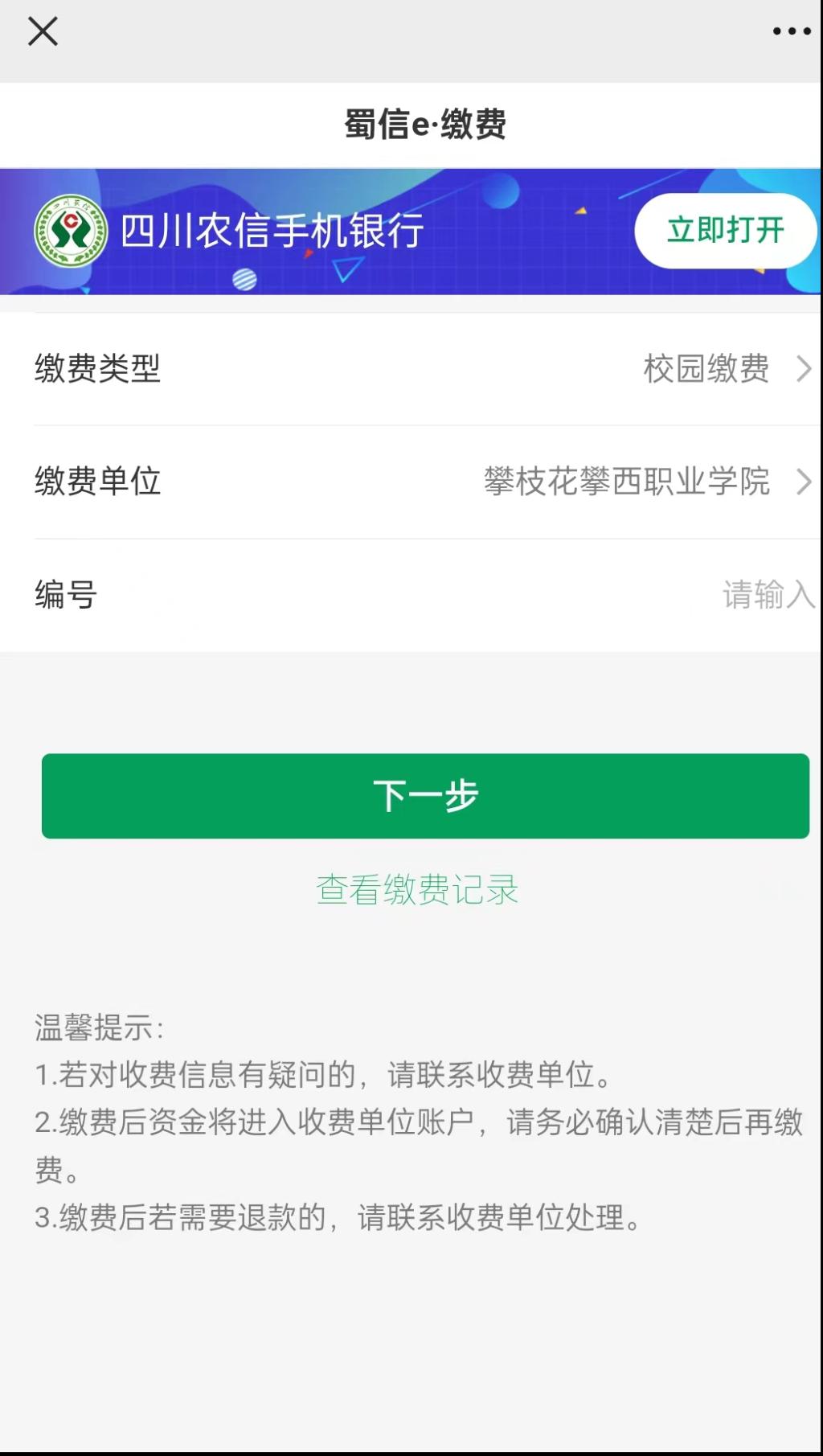 1.用微信、手机农商行APP扫描学院农信二维码,进入网上蜀信e缴费系统。